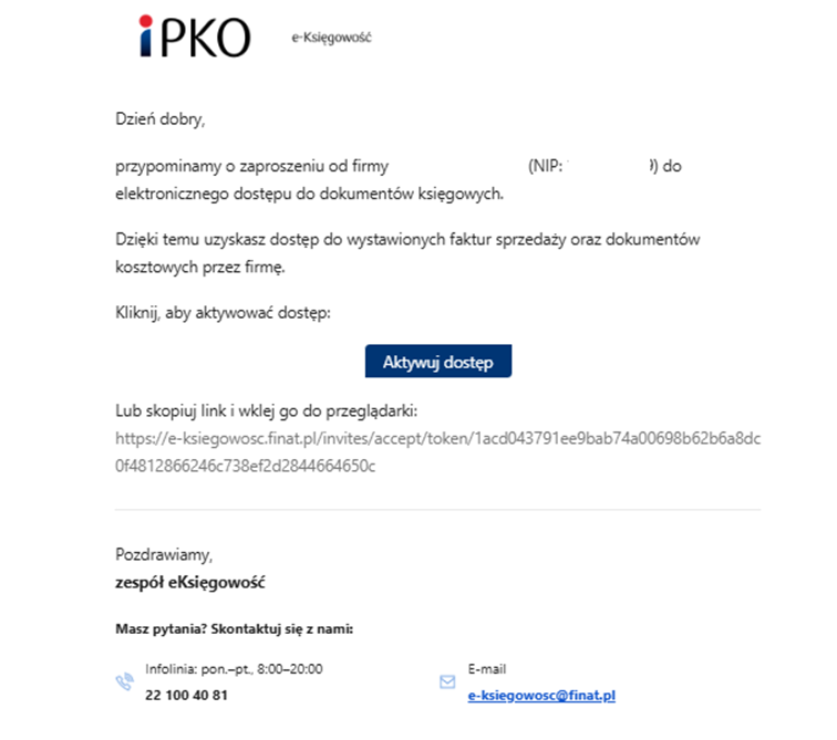 Księgowa prowadząca otrzyma wiadomość na adres mailowy o następującej treści: