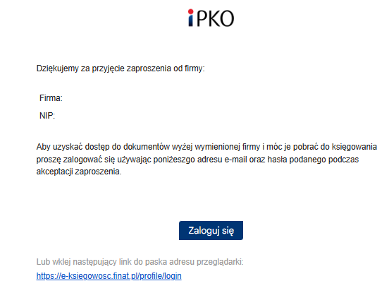 Księgowa otrzymuje maila z loginem oraz linkiem do logowania a także informacje, że należy korzystać z hasła ustawionego wcześniej.