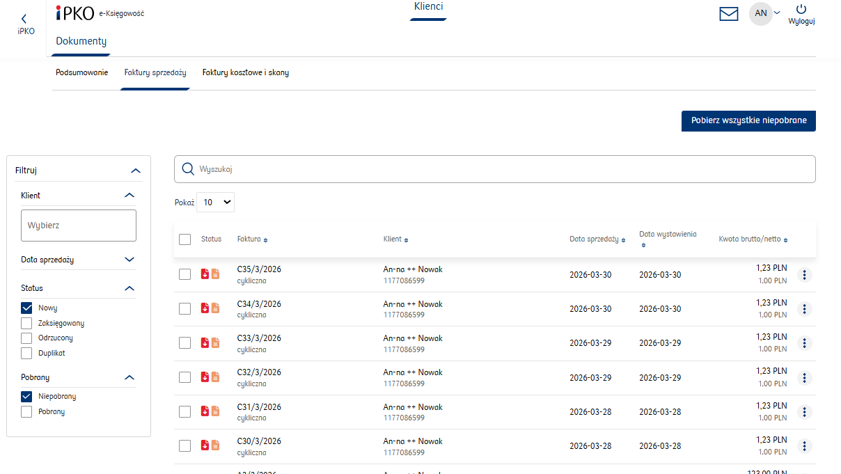 Po zalogowaniu księgowa uzyskuje dostęp do funkcji umożliwiających weryfikację i pobieranie wystawionych faktur sprzedaży, a także przegląd oraz pobieranie wprowadzonych skanów faktur kosztowych.