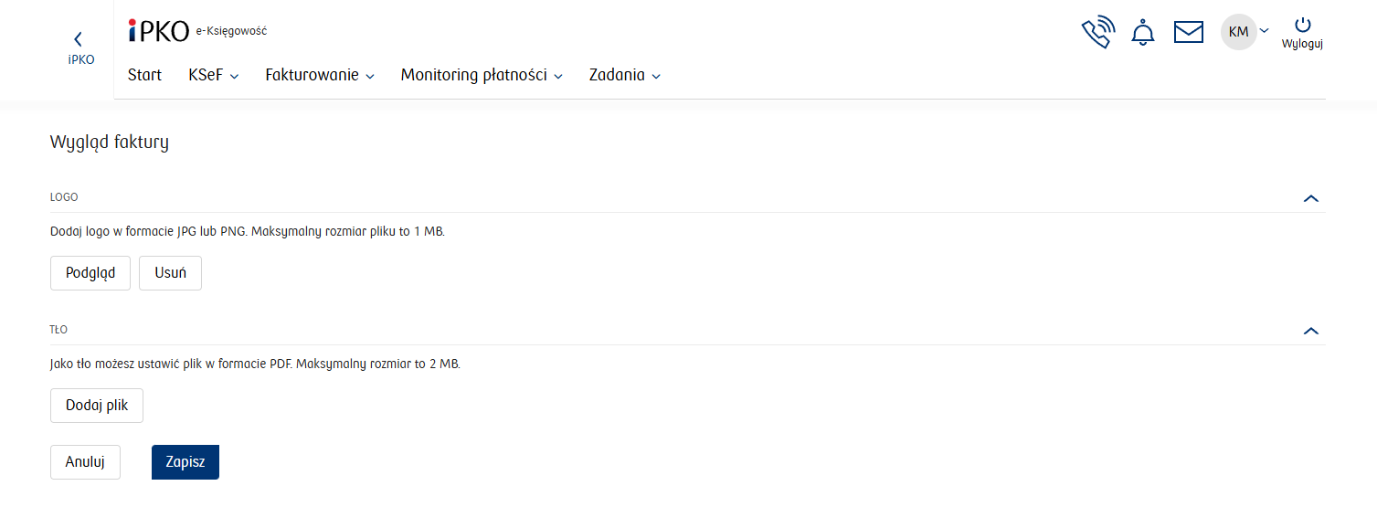 Dozwolonym rozszerzeniem tła faktury jest PDF a jego maksymalny rozmiar to 2 MB.