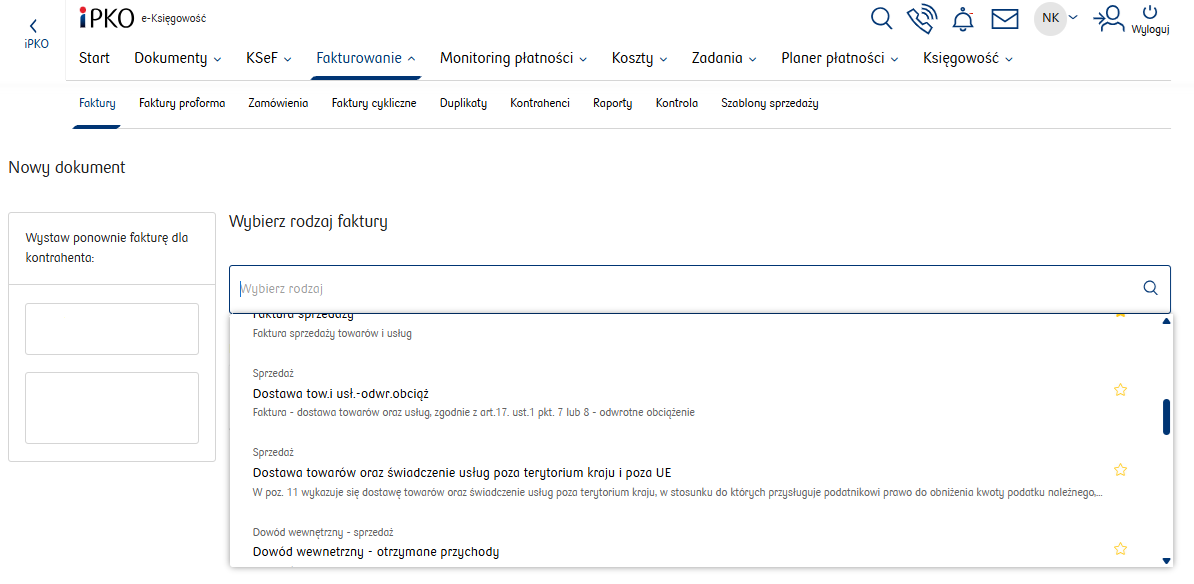 Szablony do wyboru dostępne są po przejściu do zakładki Fakturowanie/Faktury i wybraniu opcji Wystaw z szablonu.