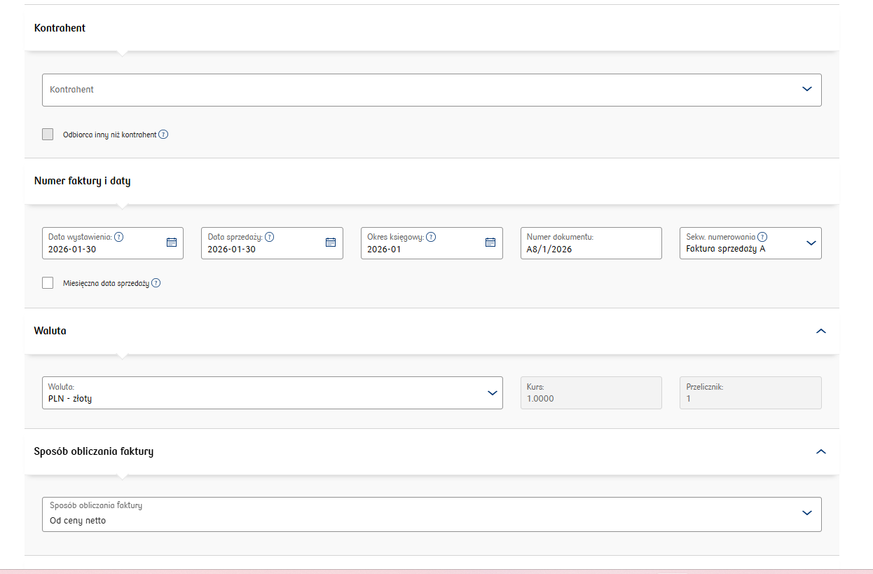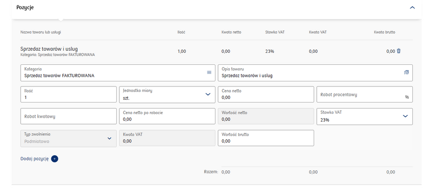 - complete the document items (description, price, quantity, VAT rate complete the PKWiU code, GTU and transaction type (if not applicable - select the option brak, leave the PKWiU field blank)