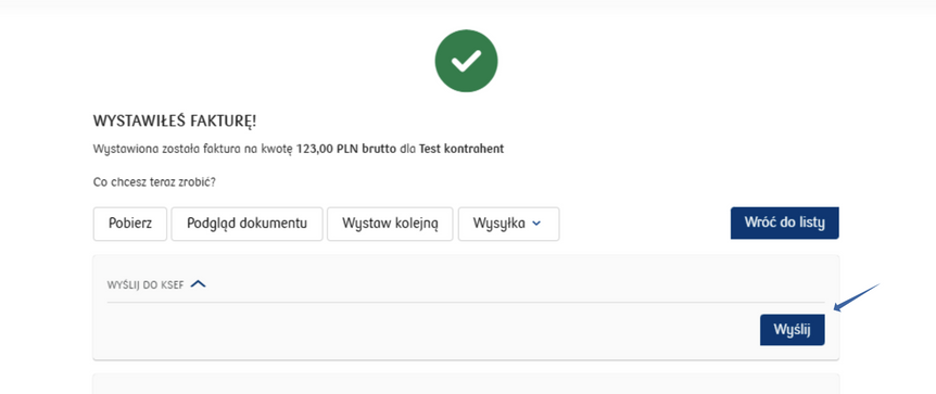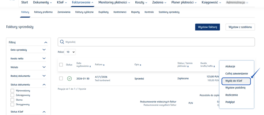Go back to the Fakturowanie/Faktury tab, from where you can also send the invoice to the National e-Invoice System by hovering the cursor over the three dots at the end of the line and selecting the Wyślij do KSeF option.